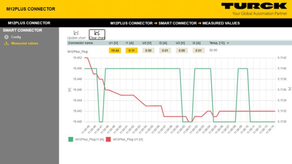 Besides the incorporated measurement technology, the M12Plus also features an onboard Bluetooth chip. This enables it to measure voltages and currents and send these measured values to a data interface in the plant, such as Turck’s TBEN-PLC. A Bluetooth dongle enables the robust IP67 controller to read a host of Bluetooth-enabled devices, and the scan intervals can be adjusted for the particular application in order to ensure optimum performance. The cable data is transferred to the controller in real time. This information can be used to determine potential issues such as voltage drops in the cable or the plug contact, even before the connection actually fails. If required, the controller can be programmed so that an alarm is triggered as soon as a specific threshold value is reached.