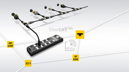 Thanks to the integrated RFID U data interface with cyclical process data transmission, the user benefits from fast and easy access to HF and UHF functions such as Idle mode. The EtherCAT module is thus ideal for use in RFID applications involving tags in very rapid succession, such as hanging goods in materials handling.
